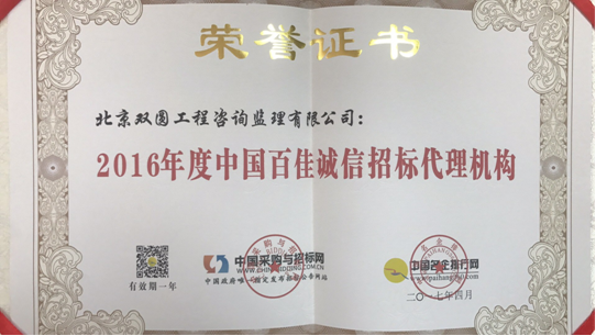 北京雙圓工程咨詢監(jiān)理有限公司經(jīng)中國采購與招標(biāo)網(wǎng)、中國名企排行網(wǎng)組建的評委會評審,獲得了“2016年度中國百佳誠信招標(biāo)代理機(jī)構(gòu)”榮譽(yù)稱號。