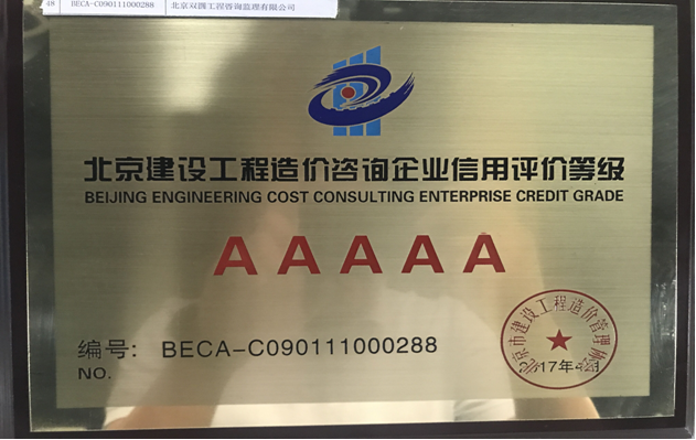 北京雙圓工程咨詢監(jiān)理有限公司經(jīng)北京市建設工程造價管理協(xié)會組建的評委會評審,獲得了“北京建設工程造價咨詢企業(yè)信用評價等級AAAAA”認證。