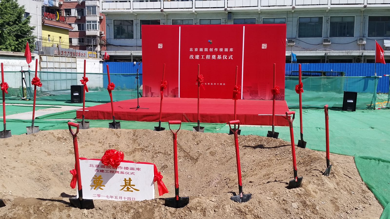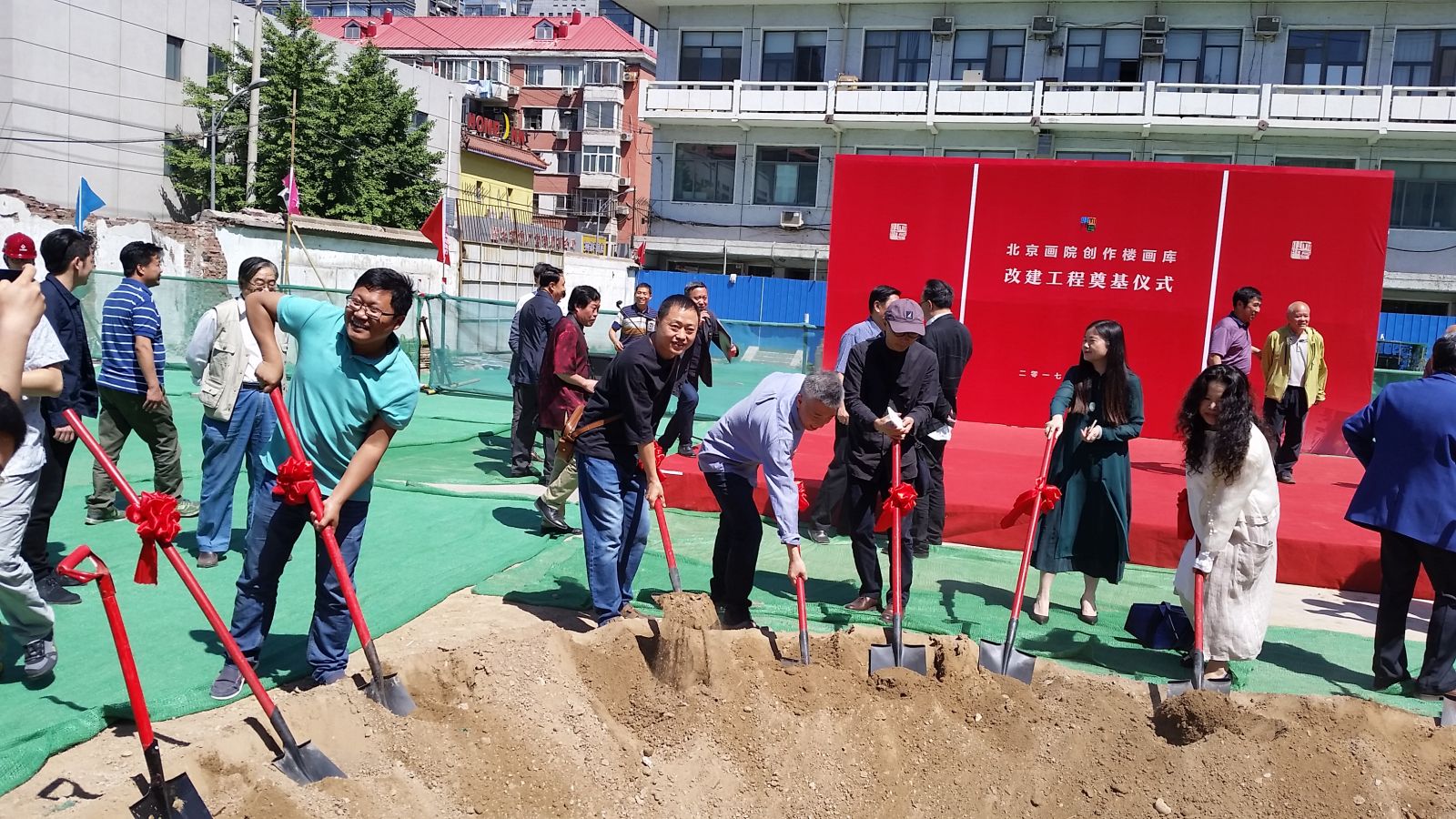 當天,北京畫院創(chuàng)作樓畫庫改建工程奠基儀式同時開啟,北京市委宣傳部主管領導,畫院院長王明明,畫院黨委書記雷波, 設計、 施工、 監(jiān)理單位的主要領導以及眾多老畫家,中青年畫家、藝術家等參加了奠基儀式。落成后的新樓將具備創(chuàng)作、收藏、教學、國際交流等多方位的實用空間,為北京畫院的多元化發(fā)展提供了更多可能。