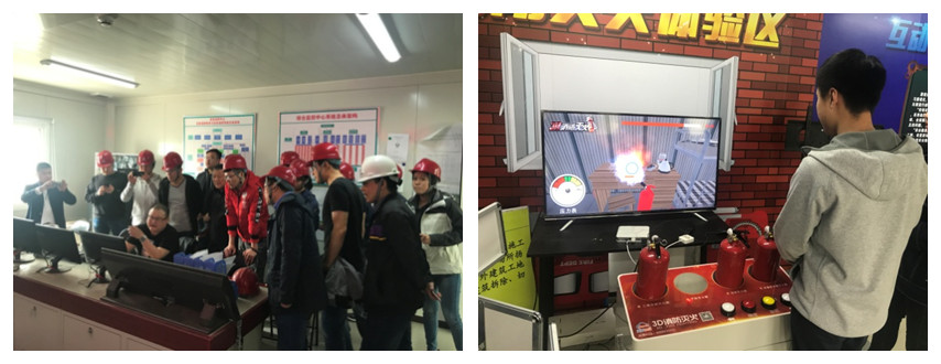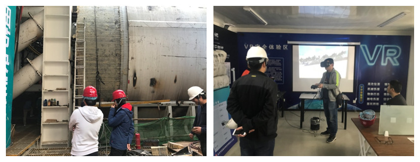 現(xiàn)場兩臺盾構(gòu)機(jī)均處于待命狀態(tài),一臺正在拆除復(fù)環(huán),另一臺做最后掘進(jìn)前的準(zhǔn)備工作。長達(dá)約30分鐘的盾構(gòu)參觀后,大家又來到了盾構(gòu)監(jiān)控室,盾構(gòu)項目主要負(fù)責(zé)人又向大家詳細(xì)解讀了監(jiān)控屏上的各項數(shù)據(jù)及控制方法,對大家的問題一一解答。隨后,各團(tuán)員又來到VR體驗式,親身體驗發(fā)生安全事故時的感受,并學(xué)習(xí)遇不同火源如何選擇滅火方式。
