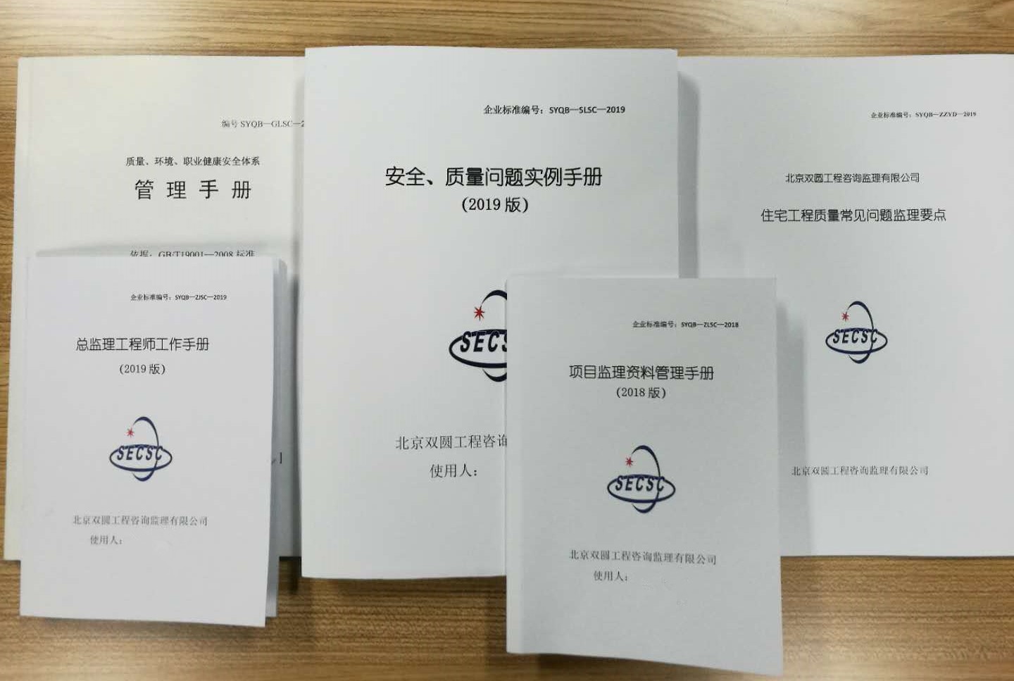為提高北京雙圓工程咨詢監(jiān)理有限公司工程咨詢以及工程監(jiān)理服務(wù)水平,公司編制發(fā)布了“四個手冊、一個要點(diǎn)”:《質(zhì)量、環(huán)境、職業(yè)健康安全管 理 手 冊》2017.1版(SYQB—GLSC—2017)、《總監(jiān)理工程師工作手冊》2019版(SYQB-ZJSC-2019)、項目監(jiān)理資料管理手冊》2018版(SYQB-ZLSC-2018)、《安全、質(zhì)量問題實例手冊》2019版(SYQB-SLSC-2019)、《住宅工程質(zhì)量常見問題監(jiān)理要點(diǎn)》2019版 (SYQB—ZZYD—2019),現(xiàn)已全面實施。