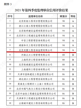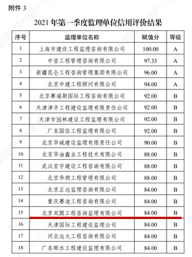 2021年北京雙圓監(jiān)理公司在中國雄安集團(tuán)組織的監(jiān)理企業(yè)季度信用評比中取得了三次A級(其中第二、三季度均獲得第一名),一次B級的優(yōu)異成績。