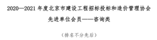 2020-2021年度北京市建設(shè)工程招標(biāo)投標(biāo)和造價(jià)管理協(xié)會(huì)先進(jìn)單位會(huì)員和優(yōu)秀個(gè)人會(huì)員評(píng)選活動(dòng)中。京標(biāo)價(jià)協(xié)授予 80家企業(yè)"2020-2021年度北京市建設(shè)工程招標(biāo)投標(biāo)和造價(jià)管理協(xié)會(huì)先進(jìn)單位會(huì)員”稱號(hào),我司位列被授先進(jìn)單位之中。授予108 位人員“2020-2021 年度北京市建設(shè)工程招標(biāo)投標(biāo)和造價(jià)管理協(xié)會(huì)優(yōu)秀個(gè)人會(huì)員”稱號(hào),其中我司陳濱、鄧俊敏、蔡永華、張一萌等4名同志被授予“優(yōu)秀個(gè)人會(huì)員”稱號(hào)。