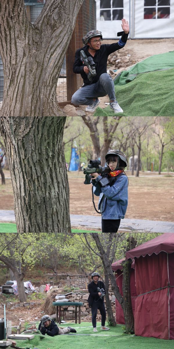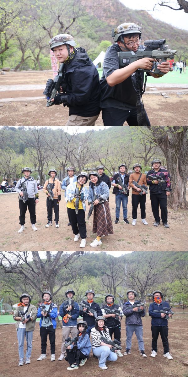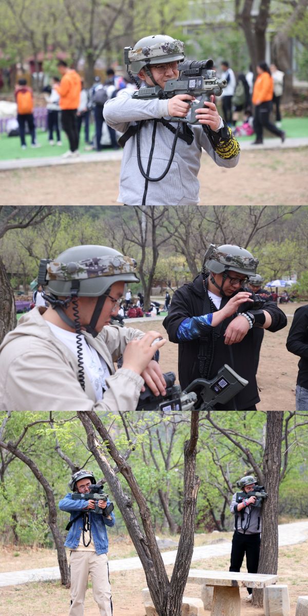 另一邊,在樹林里,培訓(xùn)老師向大家展示真人吃雞的裝備,為大家介紹作戰(zhàn)規(guī)則。各隊在作戰(zhàn)區(qū)內(nèi)撿裝備、打配合,時刻警惕四周埋伏的敵軍,努力生存到最后,為團隊贏得最終的勝利。