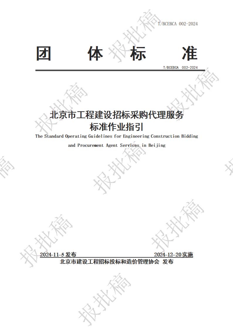 依據(jù)《北京市建設(shè)工程招標(biāo)投標(biāo)和造價(jià)管理協(xié)會(huì)團(tuán)體標(biāo)準(zhǔn)管理辦法(試行)》,《北京市工程建設(shè)招標(biāo)代理服務(wù)標(biāo)準(zhǔn)作業(yè)指引》團(tuán)體標(biāo)準(zhǔn)通過(guò)審查,北京市建設(shè)工程招標(biāo)投標(biāo)和造價(jià)管理協(xié)會(huì)已發(fā)布為團(tuán)體標(biāo)準(zhǔn),標(biāo)準(zhǔn)號(hào)為:T/BCEBCA 002-2024。該標(biāo)準(zhǔn)自2024年12月20日起實(shí)施。